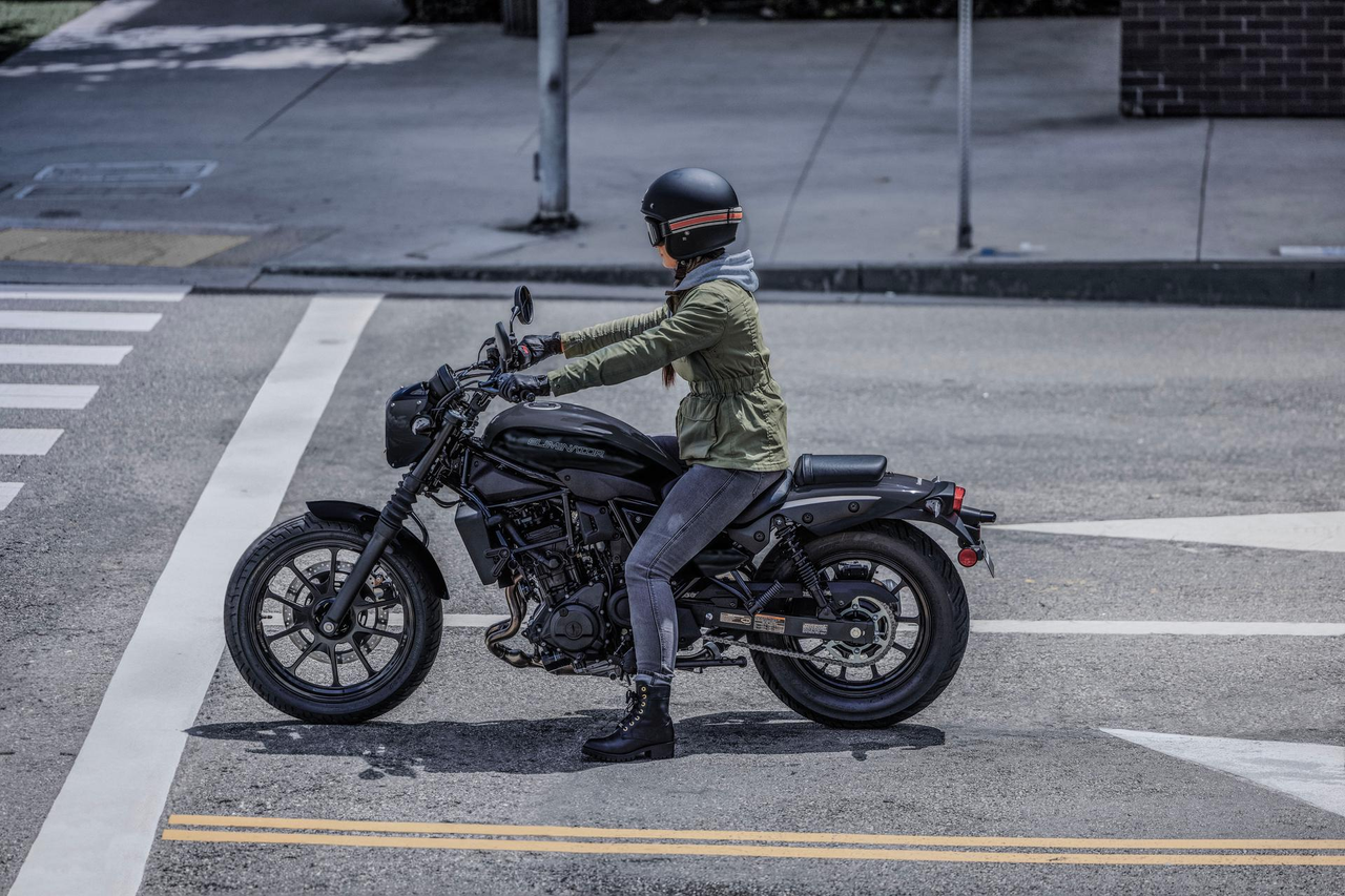At 735 mm, the Eliminator’s seat height is the lowest of Kawasaki’s 250-500cc on-road models, contributing to a reassuring reach to the ground. Accessory high and low seats enable a wide range of riders to enjoy the Eliminator with confidence and comfort.