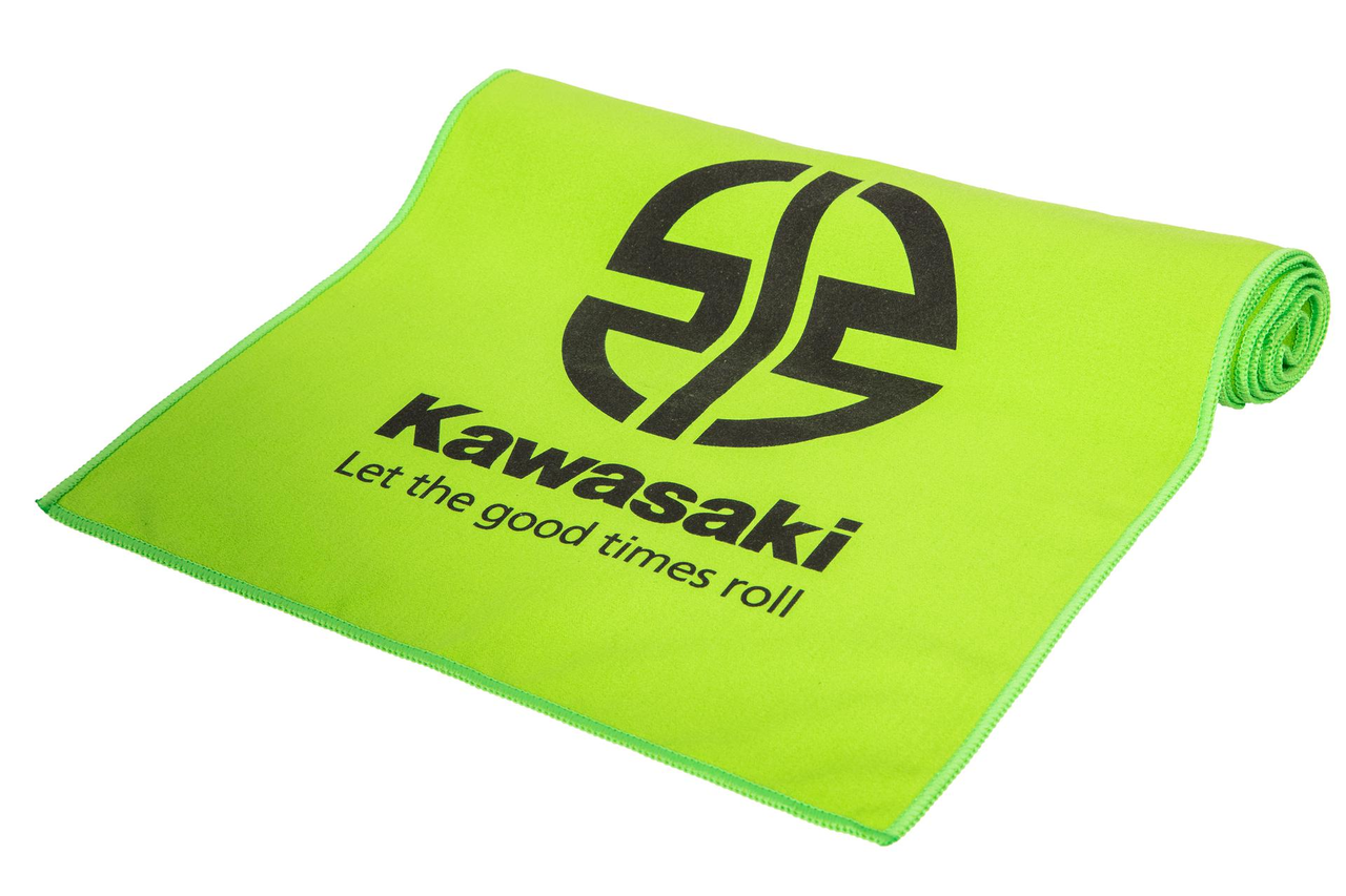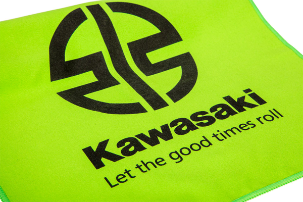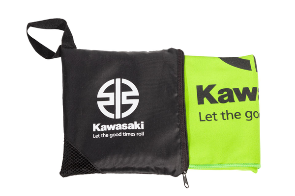 Kawasaki branded microfiber gym towel with handy storage bag. 130 x 30cm.