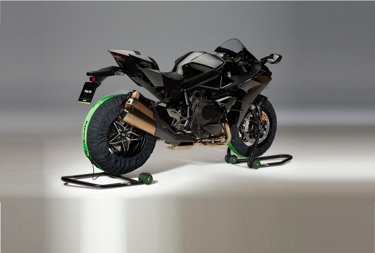 Tire warmer sets similar to the ones used by the KRT superbike team. Tire warmers with carbon-fibre heating technology. This gives fast heating of tire and rim without local overheating and a constant temperature. The sides of the tire warmer reach far over the rim flange keep the heat inside. This way the pressure of the tyre is stabilized. A high precision thermostat ensures a target temperature of 80-85 °C.