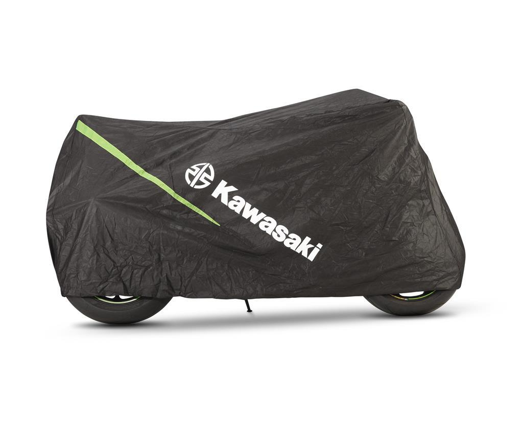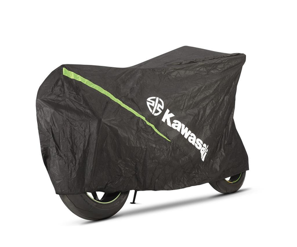 Bike cover made from breathable heavy-duty non-woven ripstop material. Kawasaki specific with green honeycomb design elements Easy reach lock buckle. 100% Polyester. With multi usable storage bag.